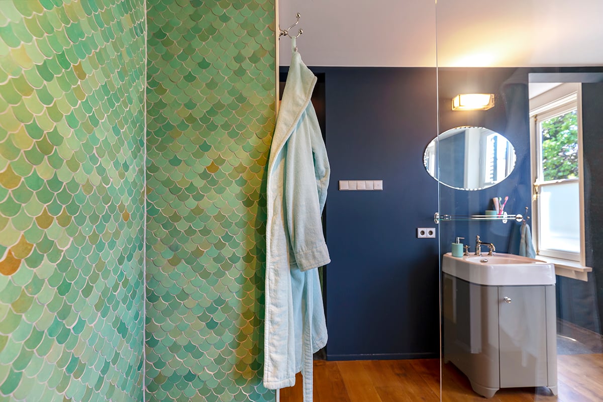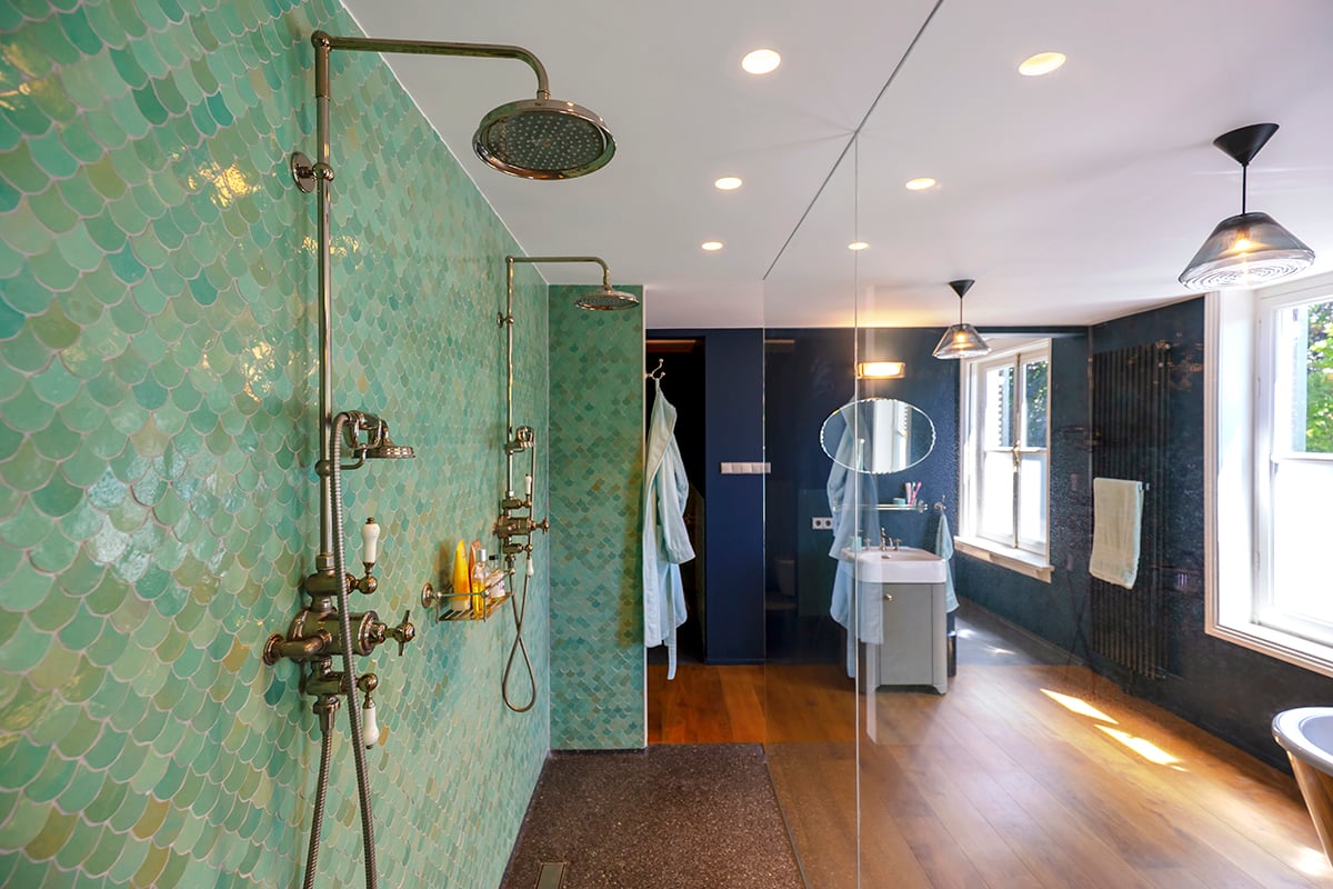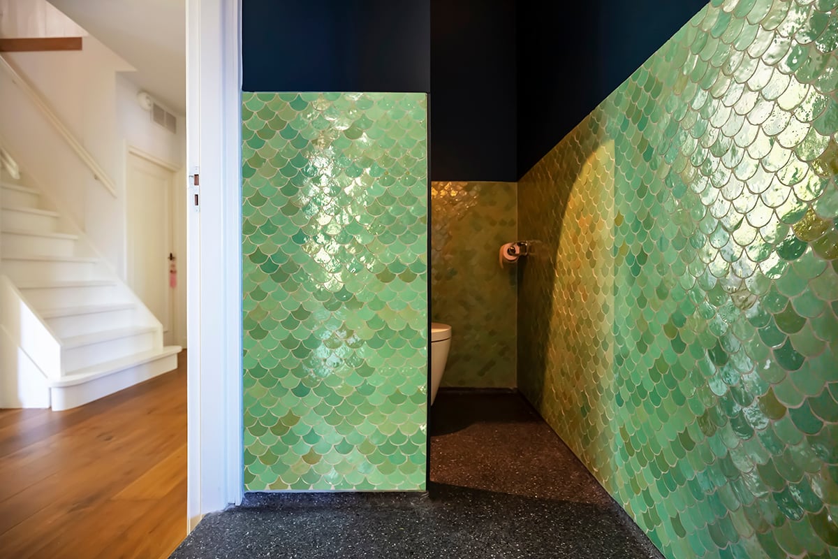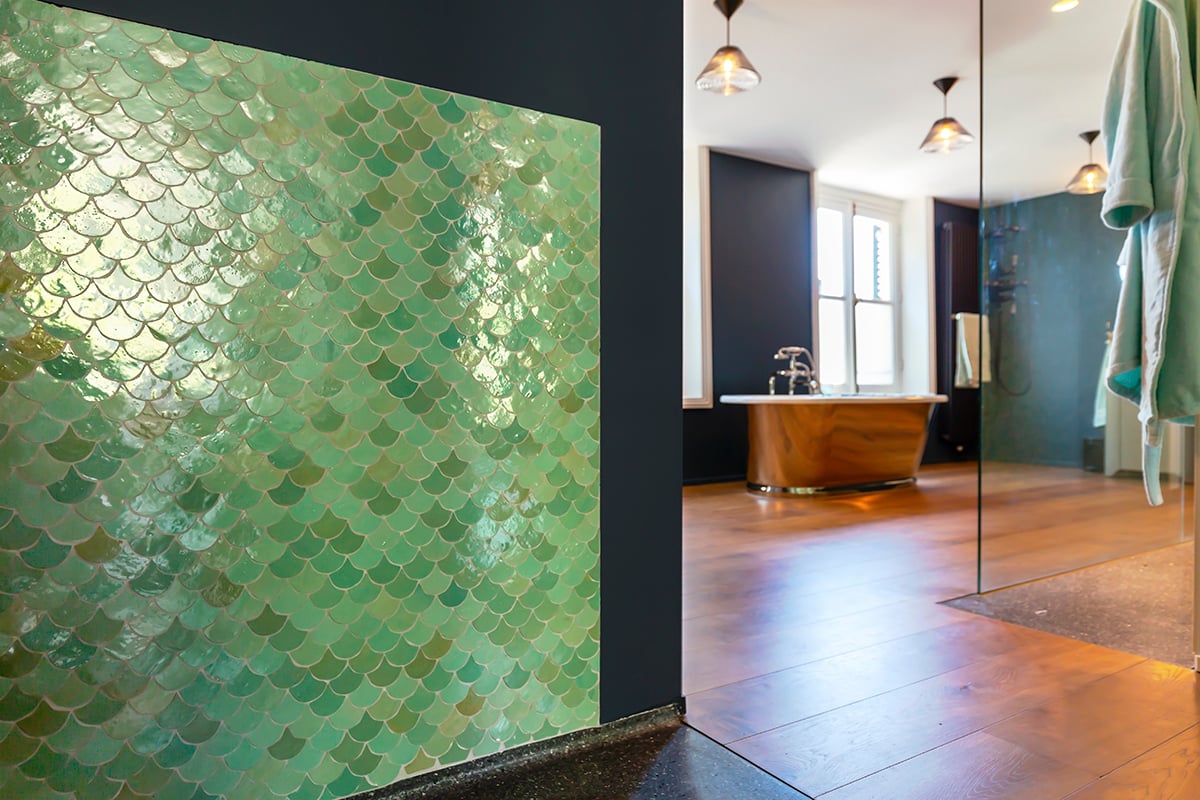 Die Zellige Turquoise Poisson Echelles ist eine handgefertigte Wandfliese im Format 5x5 cm und einer Stärke von 1 cm und kommt aus einer unserer Fabriken in Fès, Marokko. Die Oberfläche ist glänzend und lebendig mit schönen Farbnuancen. Jede Fliese, die Sie dem Karton entnehmen, ist ein Unikat. Kleinere Schönheitsfehler, Kalknarben und schwankende Farbtöne sind produktimmanent und gelten nicht als Mangel. Der rustikale Look lässt sich vortrefflich kombinieren mit einem modernen Interieur.